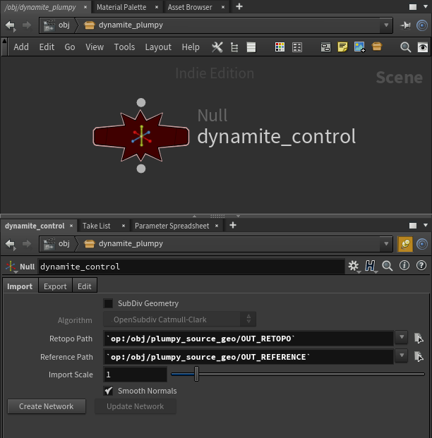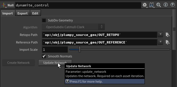 If we have made changes to our retopo or reference models, then updating the Dynamite network to accommodate them is quite simple. We press the “Update Network” button located in the “Import” tab of Dynamite Control node and the network will accommodate to our changes. Here’s what will happen in detail: