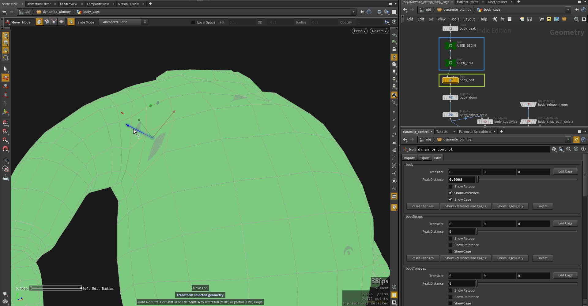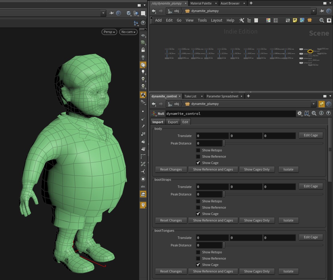 In my usual workflow I begin with isolating the first object and home on visible geometry (SPACE H). Then I tweak peak distance until I can see no interpenetration of the cage with the reference mesh. If avoiding them requires the cage mesh to be inflated way too much to my liking, I increase the peak just a tad in order to leave several interpenetrating areas, and then hit the Edit Cage button which takes me to Edit SOP inside the object’s cage network. Here I translate selected components by moving them slightly on their local Z axis. To return to Dynamite Control node, I hit the Jump Back button in Parameters Editor or the Network View. Rinse and repeat for every object in the model.