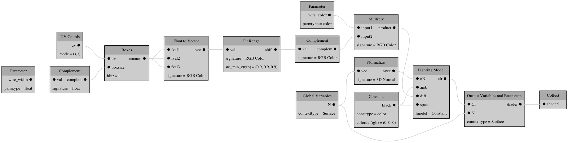 The graph above demonstrates a structure of a basic wireframe shader that will allow us to produce wireframe image which we would then take into COP Net for compositing with clay render. By creating a shading layer from the Lighting VOP and dropping a Principled Shader into the network we could mix both layers together using alpha from the second Complement VOP (counting from the left side), effectively expanding the shader into one that renders everything in single pass.