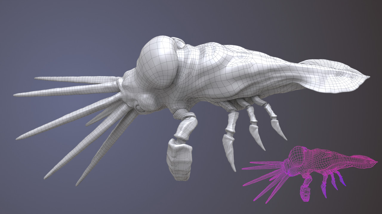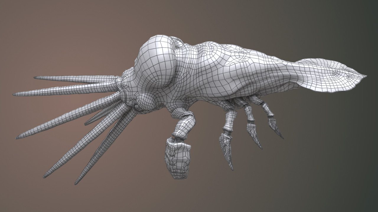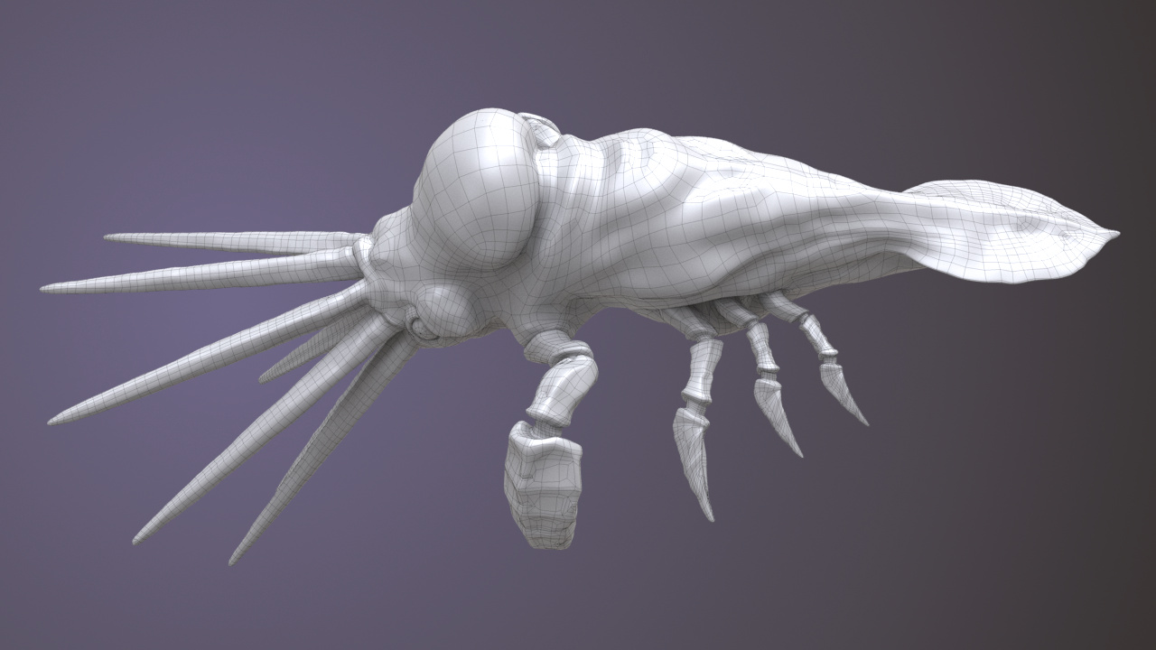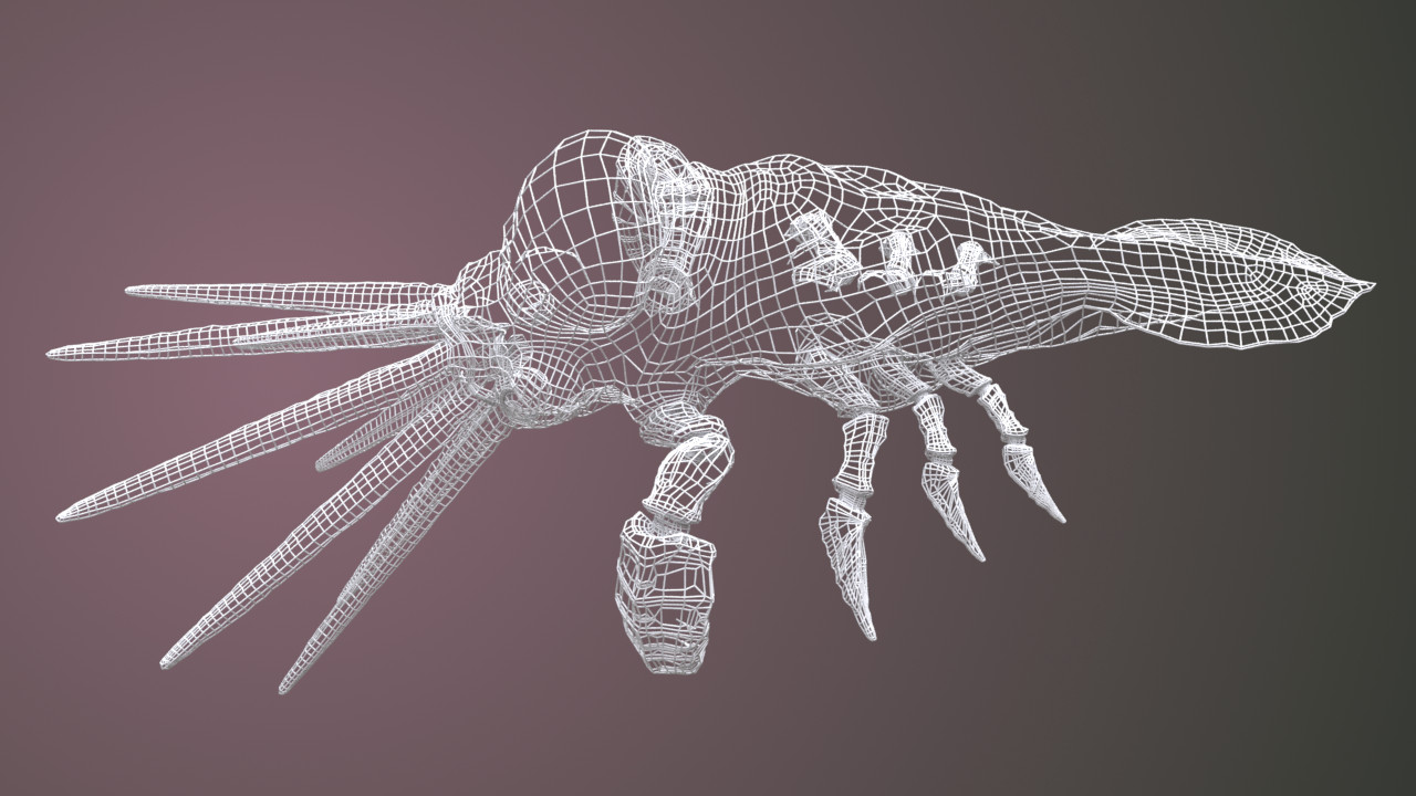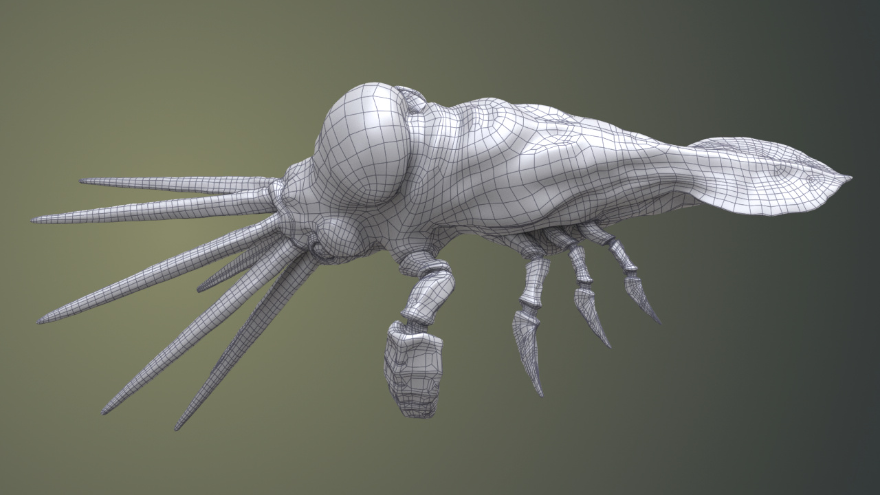 Wireframe rendered with Wren ROP. Line width is equal to 3 and is constant throughout object’s surface. Note dark homogenic areas on narrower parts of the model.