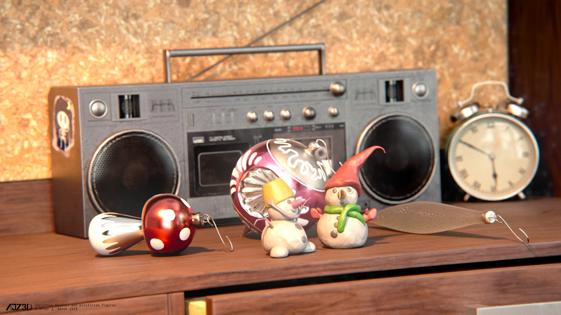 Background assets (boombox and the clock) come from PolyHaven.