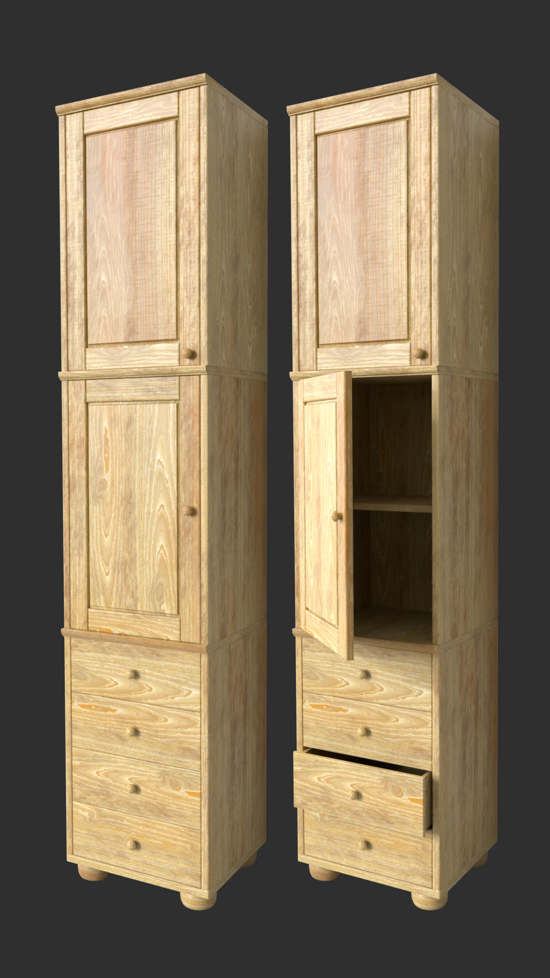 Visualization of a linen chest, or rather a tall linen shelf with doors and drawers — a furniture piece that I needed to be manufactured for one of my apartments. I designed it in Plasticity using real measurements and then retopologized and unwrapped it in Houdini. The retopologized model was textured in Substance Painter and uses one 2K pine wood PBR texture, while renders come from Karma XPU Hydra delegate. The project which I sent to carpentery service also included FreeCAD blueprints of the furniture.