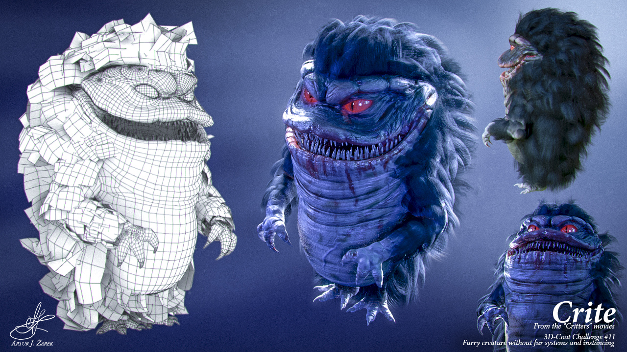 The asset was made for the 3D-Coat Community Challenge #11. The goal of the challenge was to design a furry creature without taking advantage of fur systems, instancing or any other means of automating the hair creation process, so Critter’s fur consists of 283 duplicates of five unique hand-painted texture sheets, manually distributed over the creature’s body.