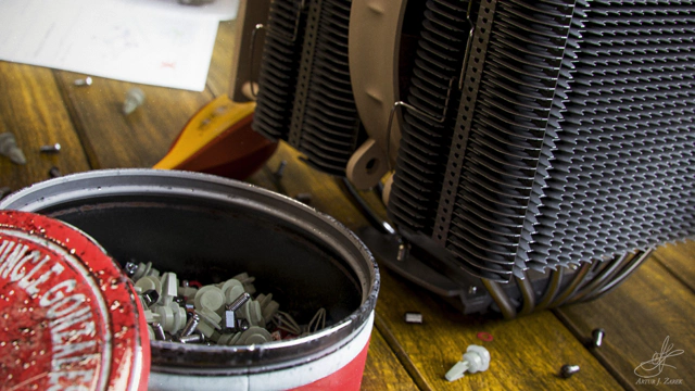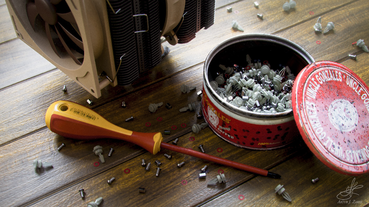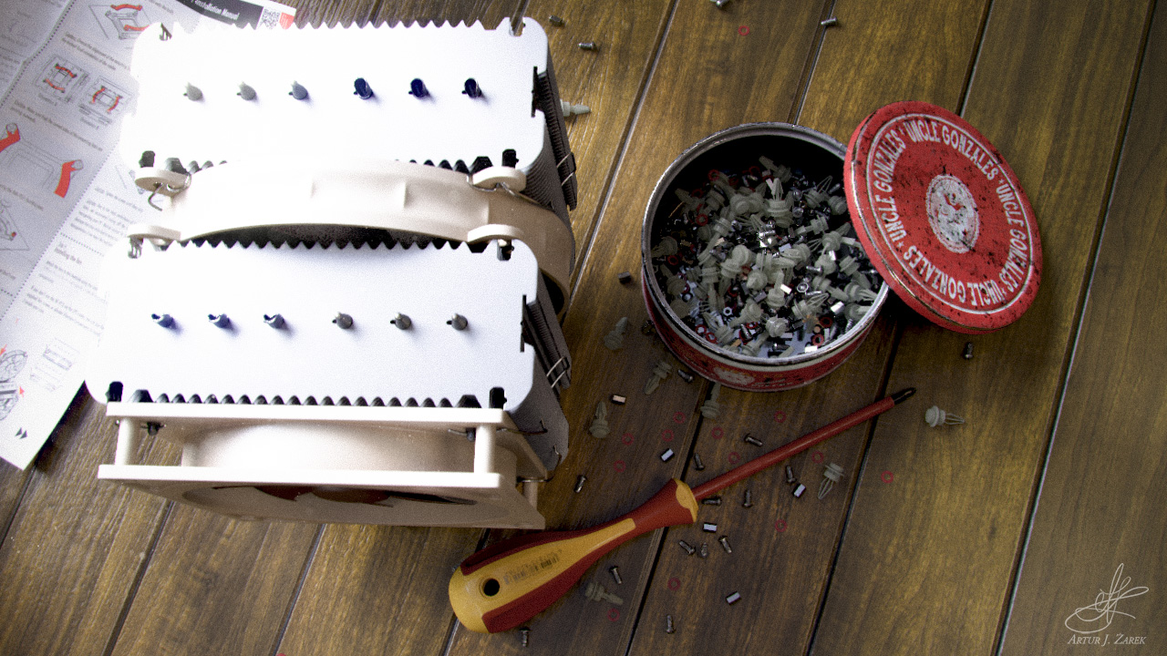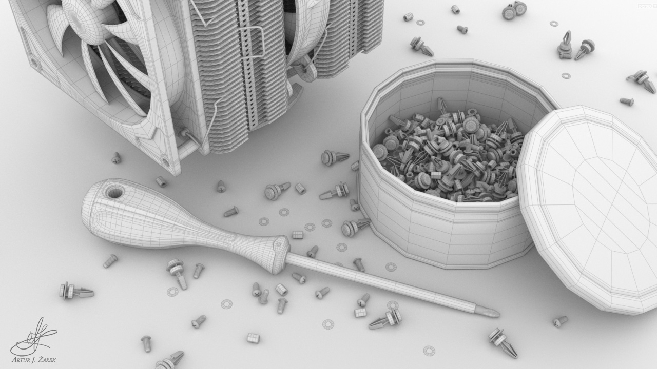 Screwdriver, CPU cooler, coffee can and all types of nuts and bolts were modeled in NVil and hand-painted in 3D Coat. Instruction manual visible on one of the renders is a scanned page from Noctua NH-D14 manual applied on an FFD’d grid. All models were made with render-time subdivision in mind.