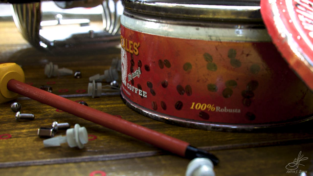 For scattering nuts and bolts throughout the scene and into the can I used a funnel collider through which I poured Bullet RBDs from a wide box emitter. It worked pretty well, but position of several objects outside of the can still required a little bit of tweaking, so I ended up baking the simulation result into geometry and manually adjusting their transforms.