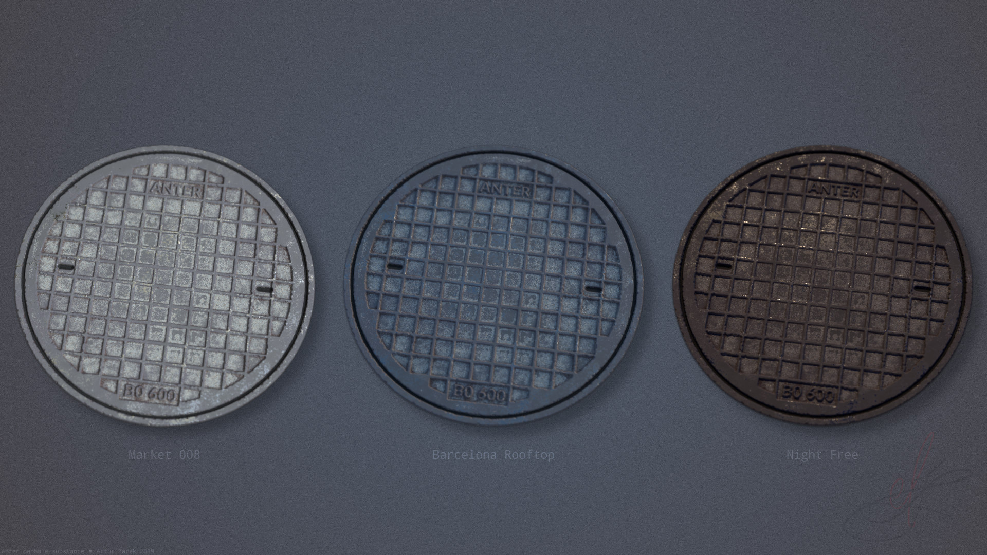 A substance material stylized to look like one of the common Polish sewer manholes. Customization allows for changing top and bottom text, dirt level and surface wear.